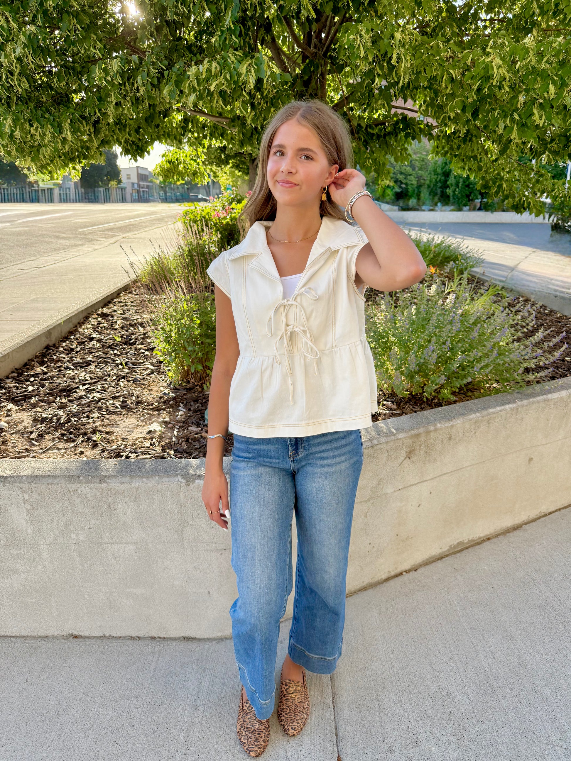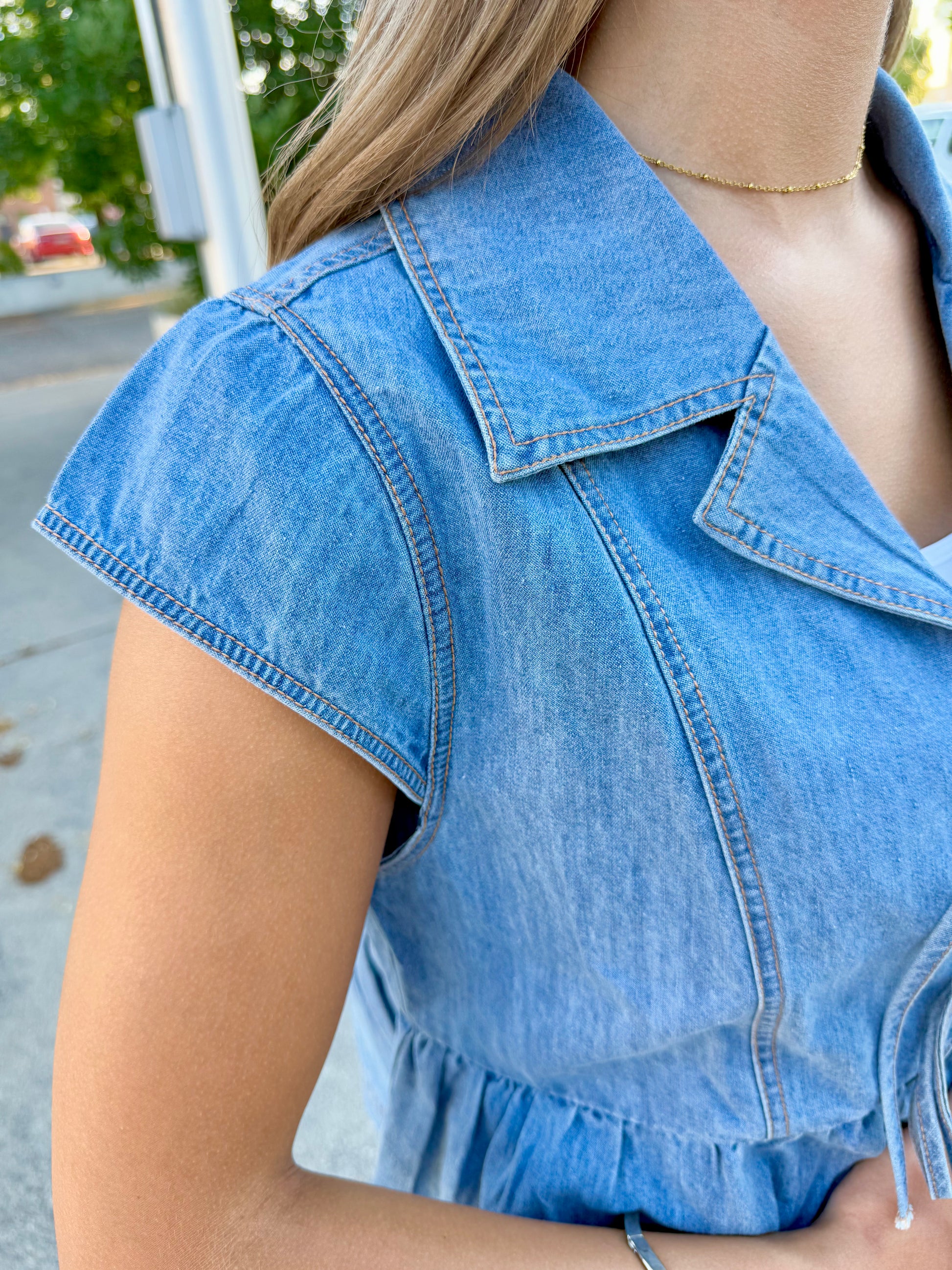 Elevate your style with the Akiko Front Tie Top, crafted from comfortable denim for a chic yet casual look. Featuring a charming collar and a stylish front tie, this top adds a playful touch to any outfit. Perfect for dressing up or down, it brings effortless charm and confidence to your wardrobe.