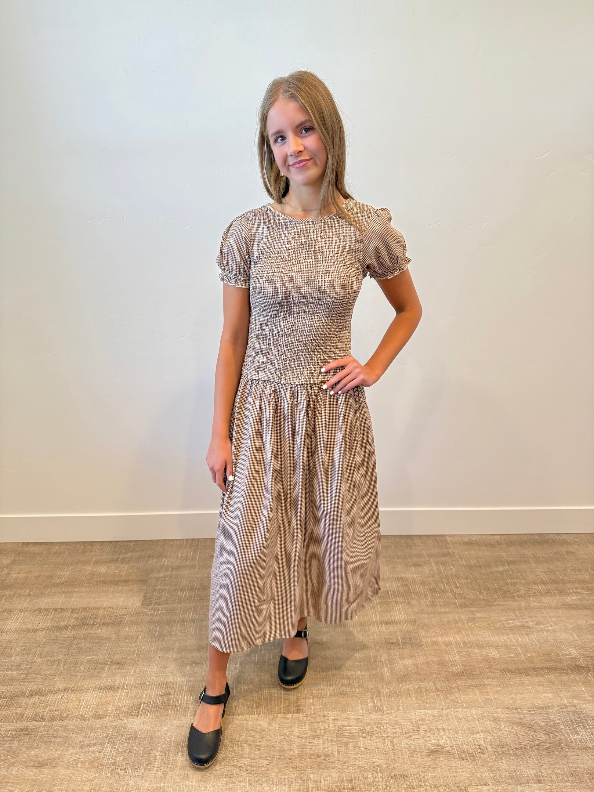 The Alyssa Gingham Dress combines a charming brown and white gingham pattern with a smocked bodice that offers a flattering fit. Its round neckline and ruffle elastic sleeves add a touch of playful elegance, while the lightweight fabric ensures comfort all day long. Perfectly designed to be super cute and easy to wear, this dress is a delightful addition to any wardrobe.