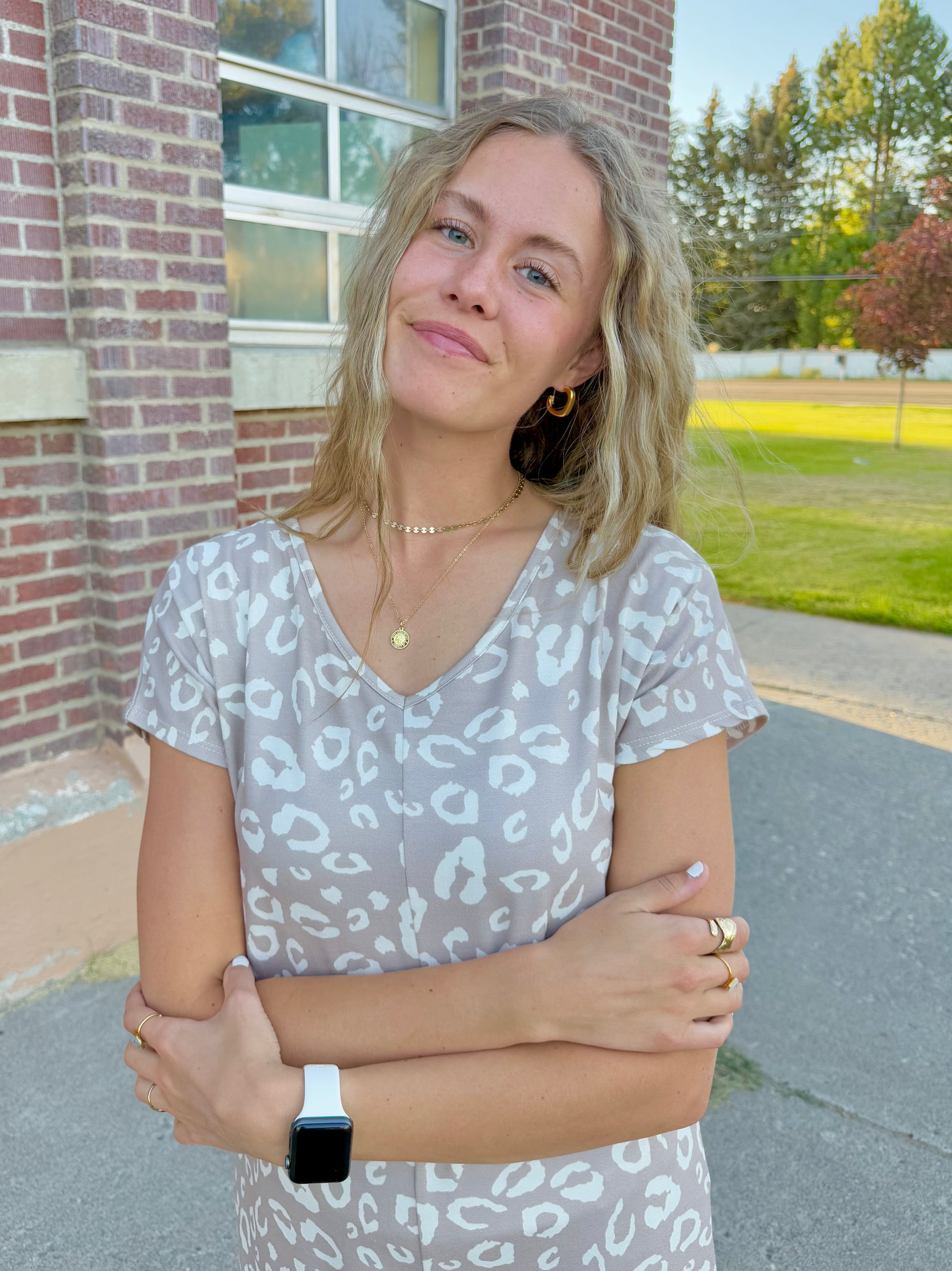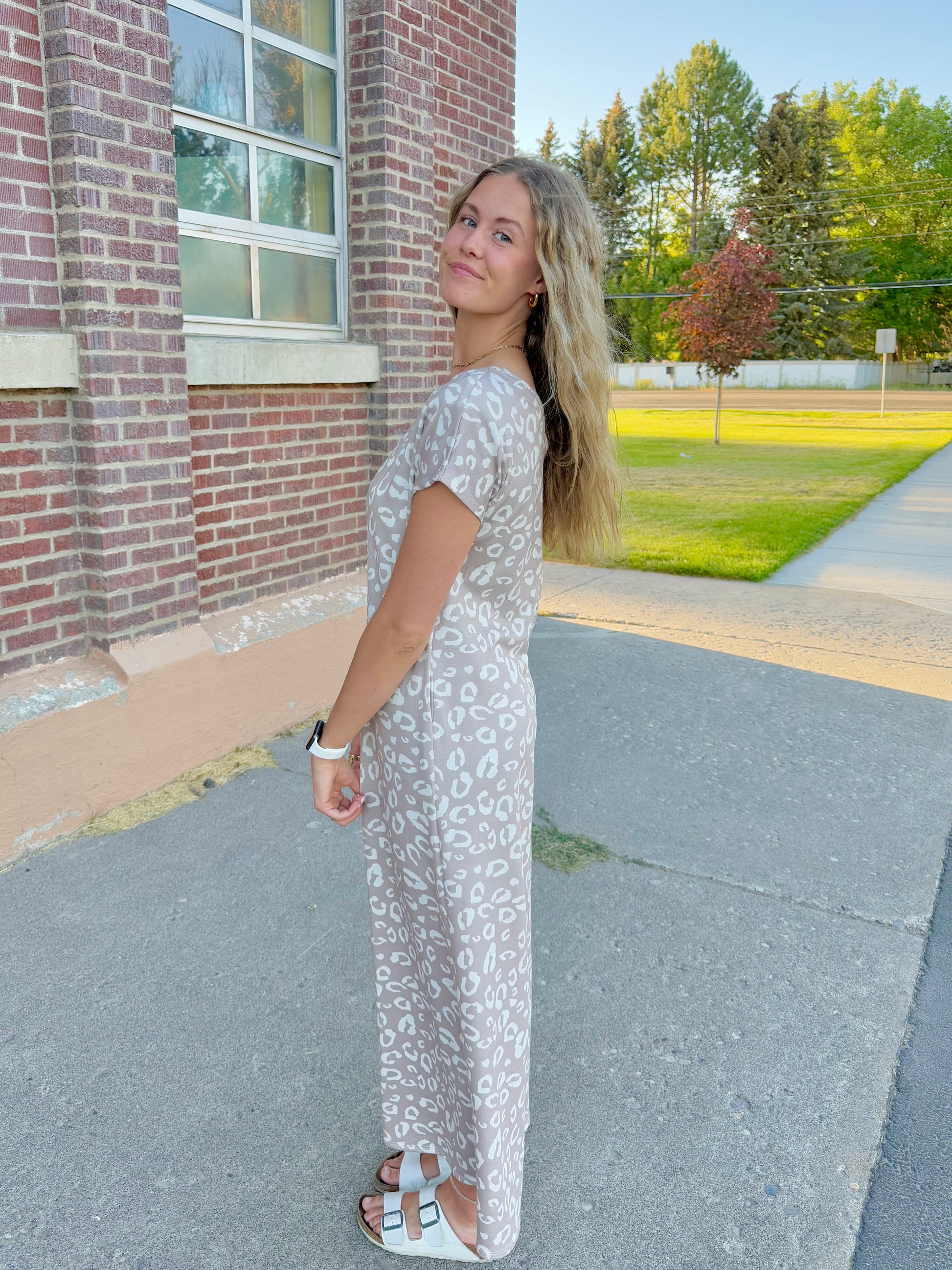 The Amira Leopard Jumpsuit offers a soft knit fabric that feels gentle against your skin. Its V neckline in both front and back provides a flattering fit, while the cap sleeve design adds a stylish touch. The wide-leg cut ensures comfort and freedom of movement, making it a perfect choice for days when you want to look great and feel at ease.