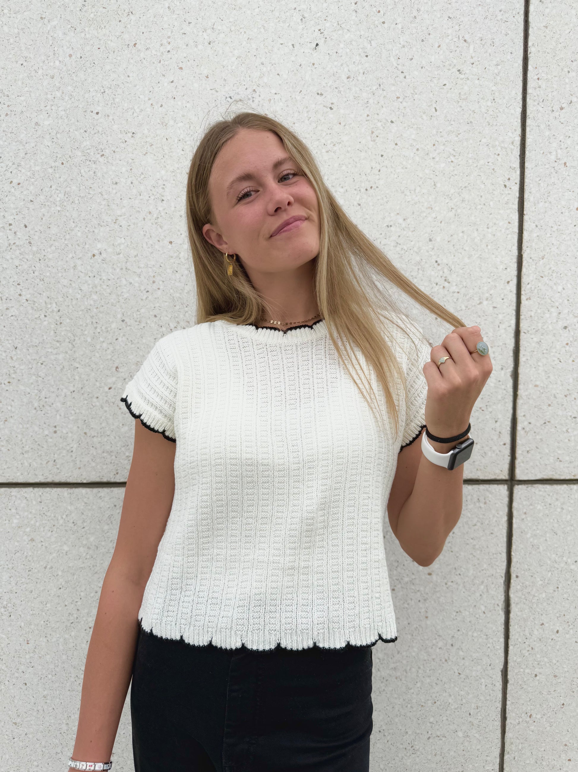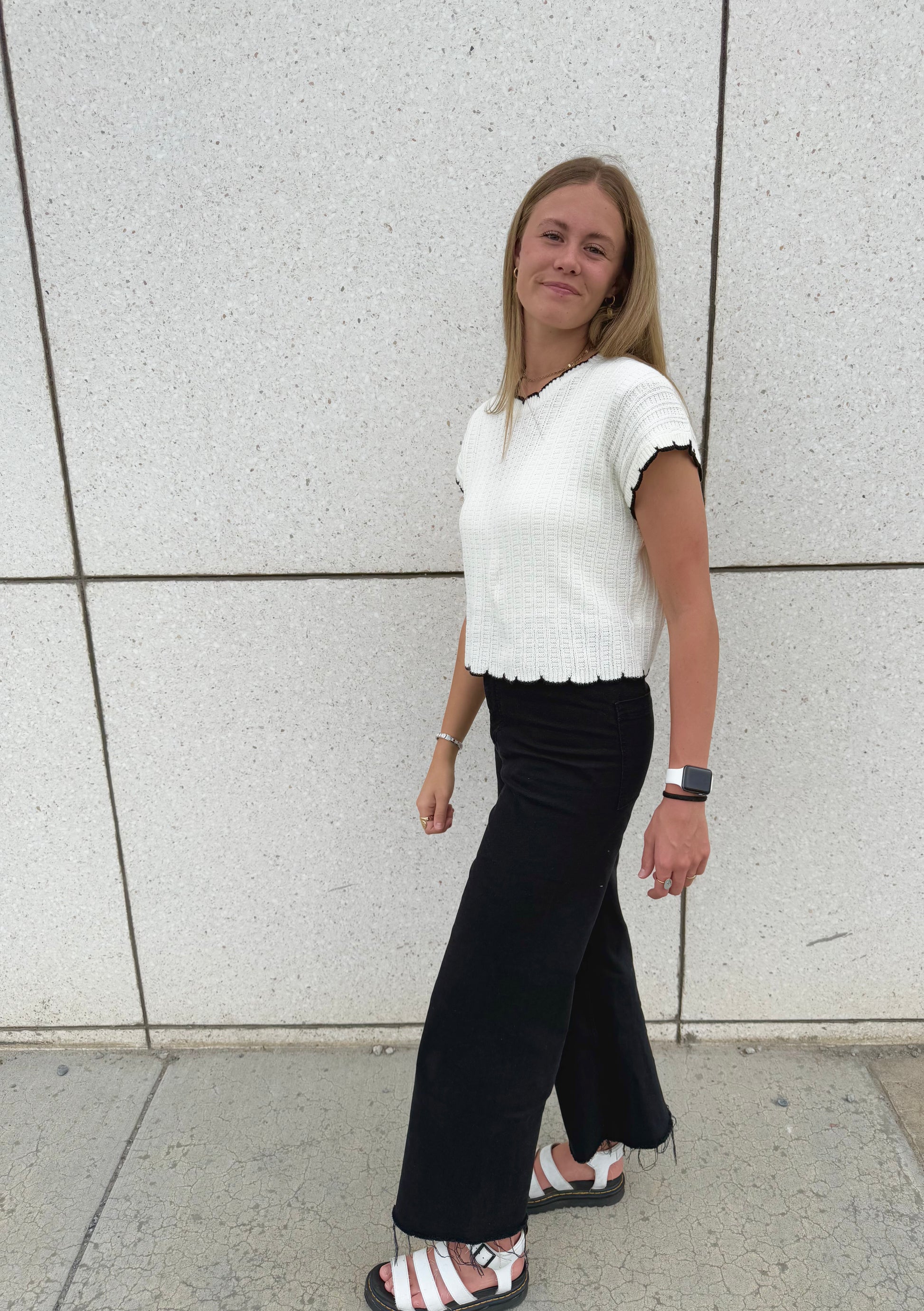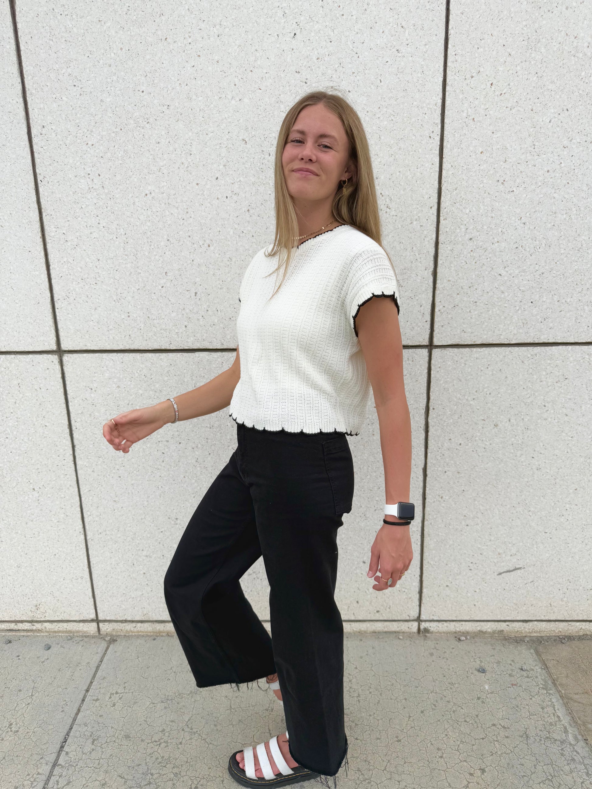 The Aspen Sweater Top is a lightweight and cozy piece featuring charming black details along the edges. Made from soft sweater material, it’s designed for easy wear and effortless style, perfect for brightening your everyday wardrobe.