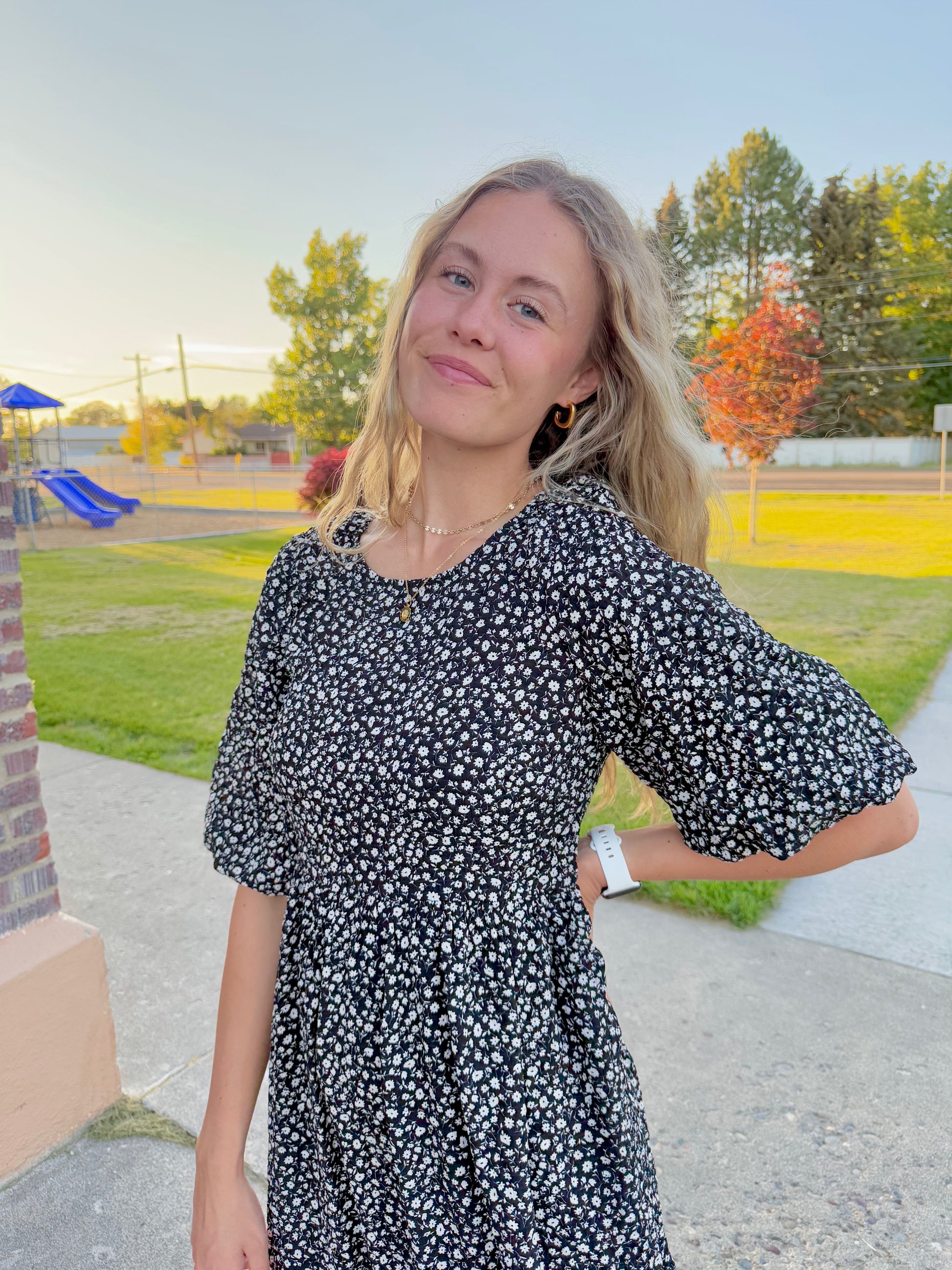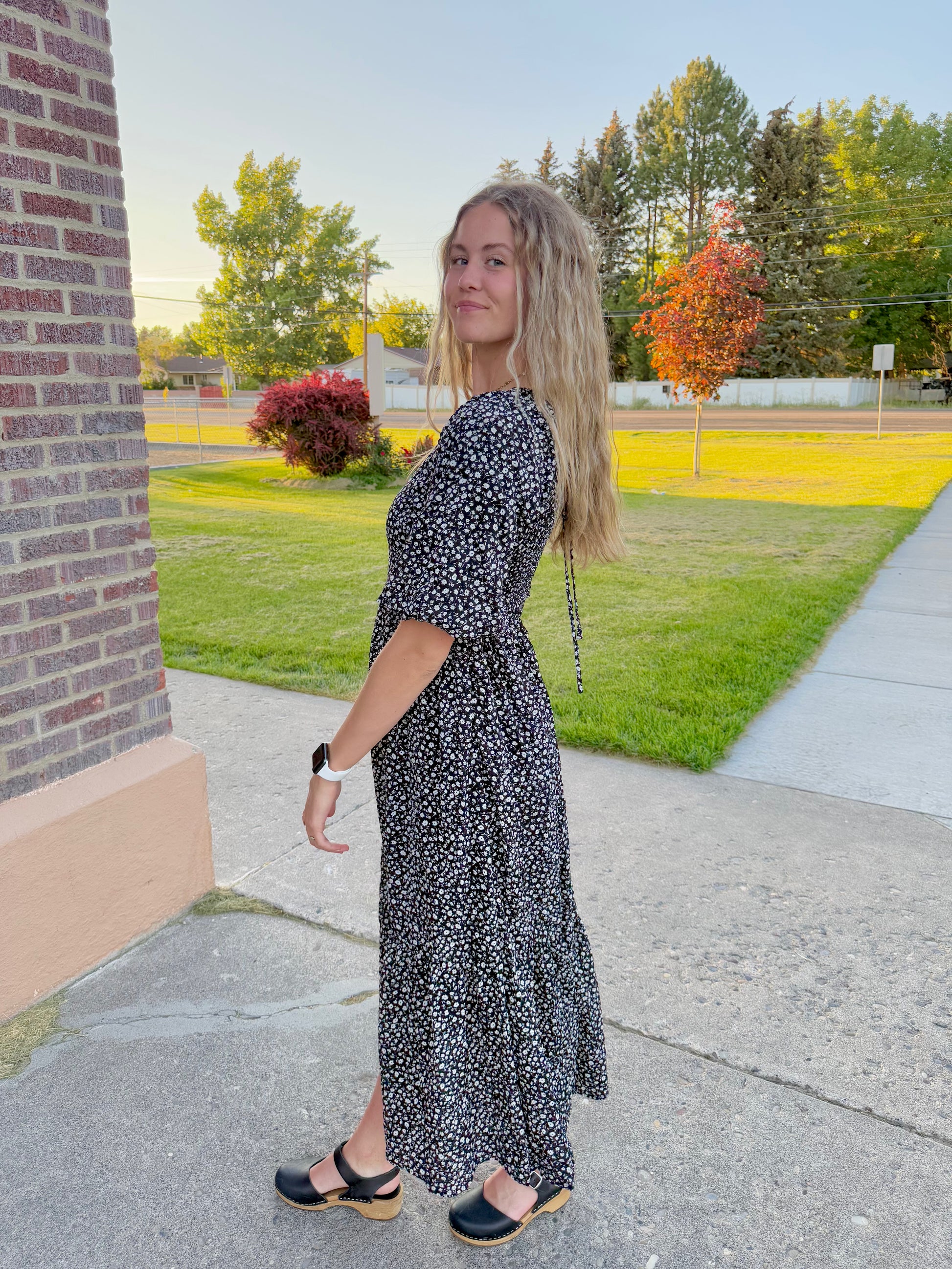 The Avery Black Floral Dress features a delicate white floral pattern on a flowing black fabric, offering a simple yet elegant look. Its smocked back bodice and elastic banded sleeves provide comfortable wear, while the adjustable strings at the back neckline add a customizable touch. The defined waistband enhances your silhouette, making this dress perfect for effortless style and all-day comfort.