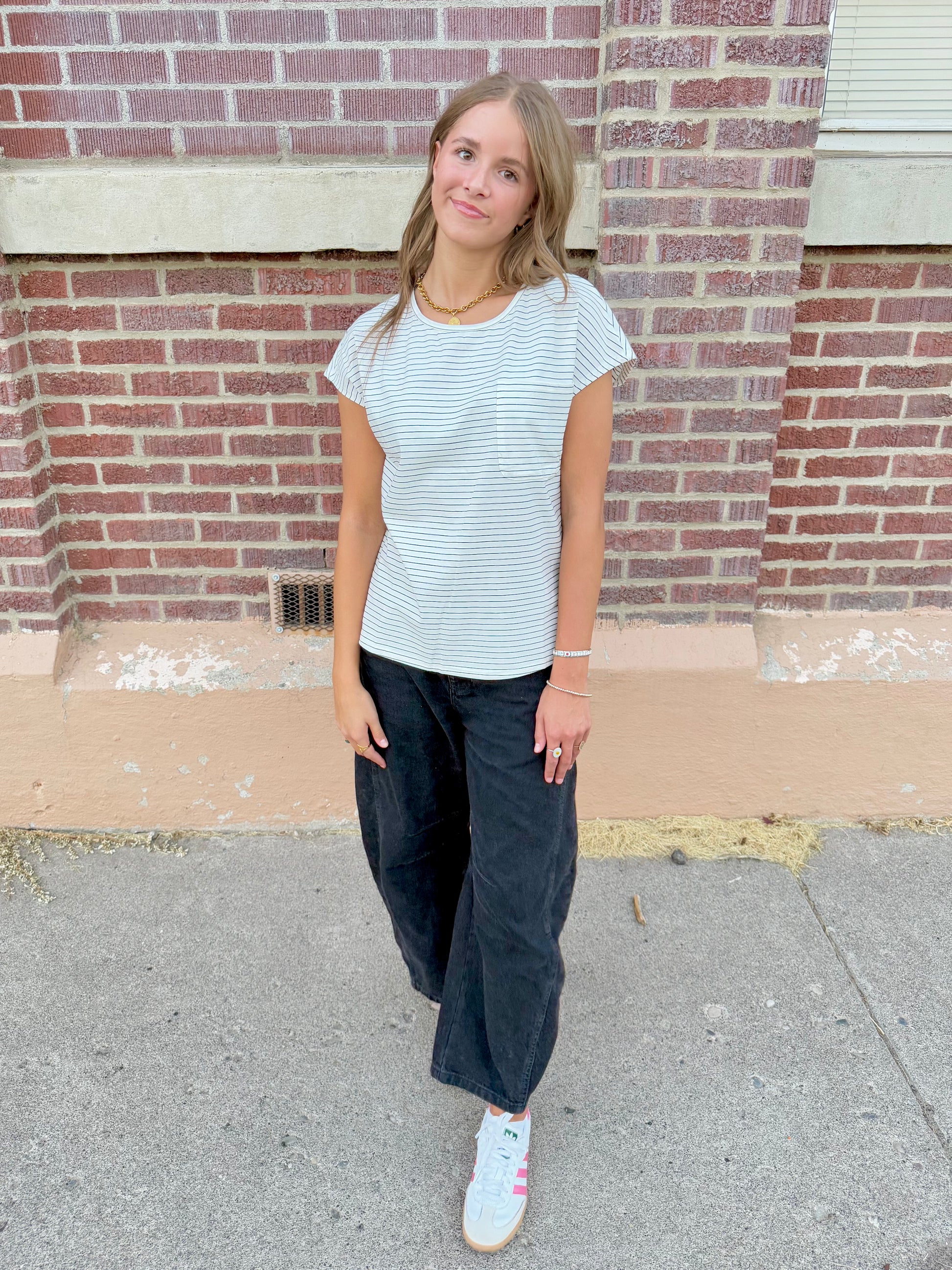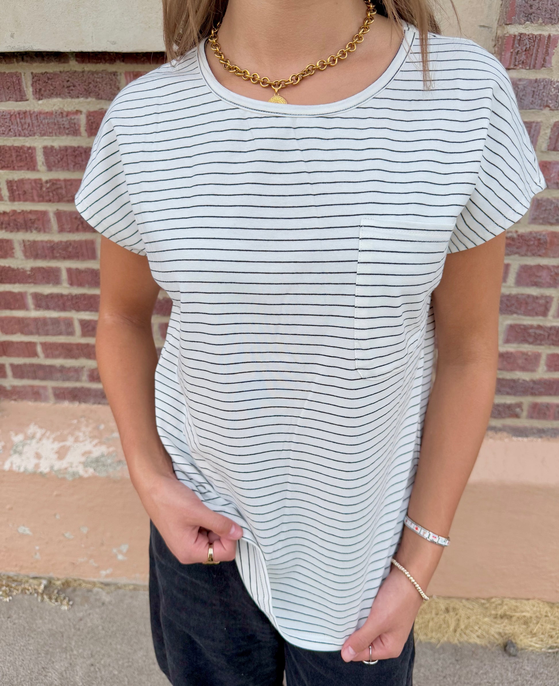 The Brielle Striped Top features simple black stripes on a crisp white background, enhanced by a cute cap sleeve design for a playful yet polished look. Its front pocket adds a subtle touch of style, while the stretchy fabric ensures comfortable wear all day. Finished with a 4-inch side slit at the bottom hem, this top offers ease of movement and a flattering silhouette. Perfect for effortless casual chic.