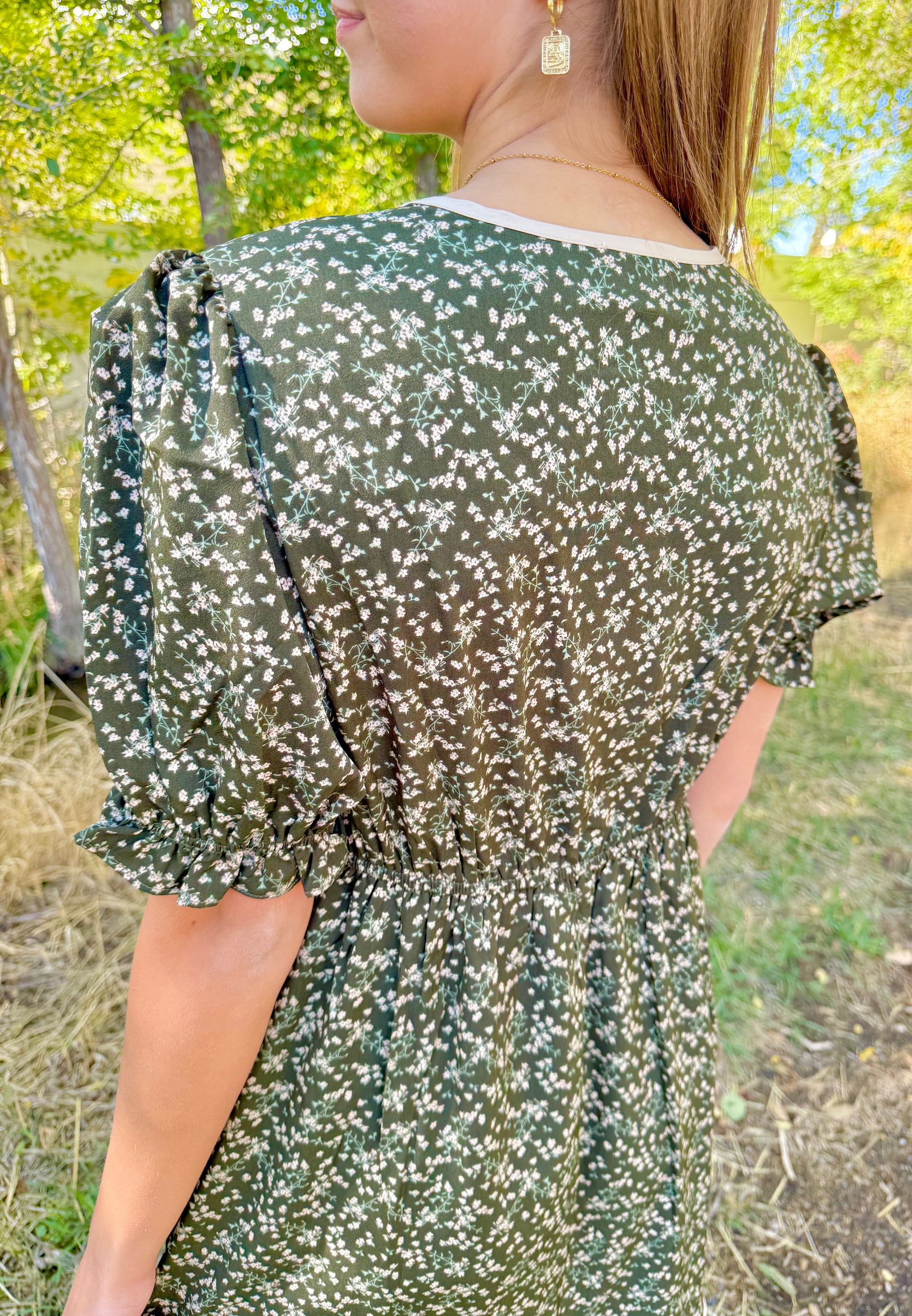 The Clara Midi Dress in a stunning forest green shade, adorned with a delicate floral pattern, offers an elegant yet comfortable fit. Featuring side pockets for convenience and a flattering V-neckline, its sleeve cuffs are gently gathered with elastic bands and subtle ruffles, adding a charming touch. Perfectly suited for the upcoming seasons, this dress blends style and ease, making it a beautiful choice for any wardrobe.