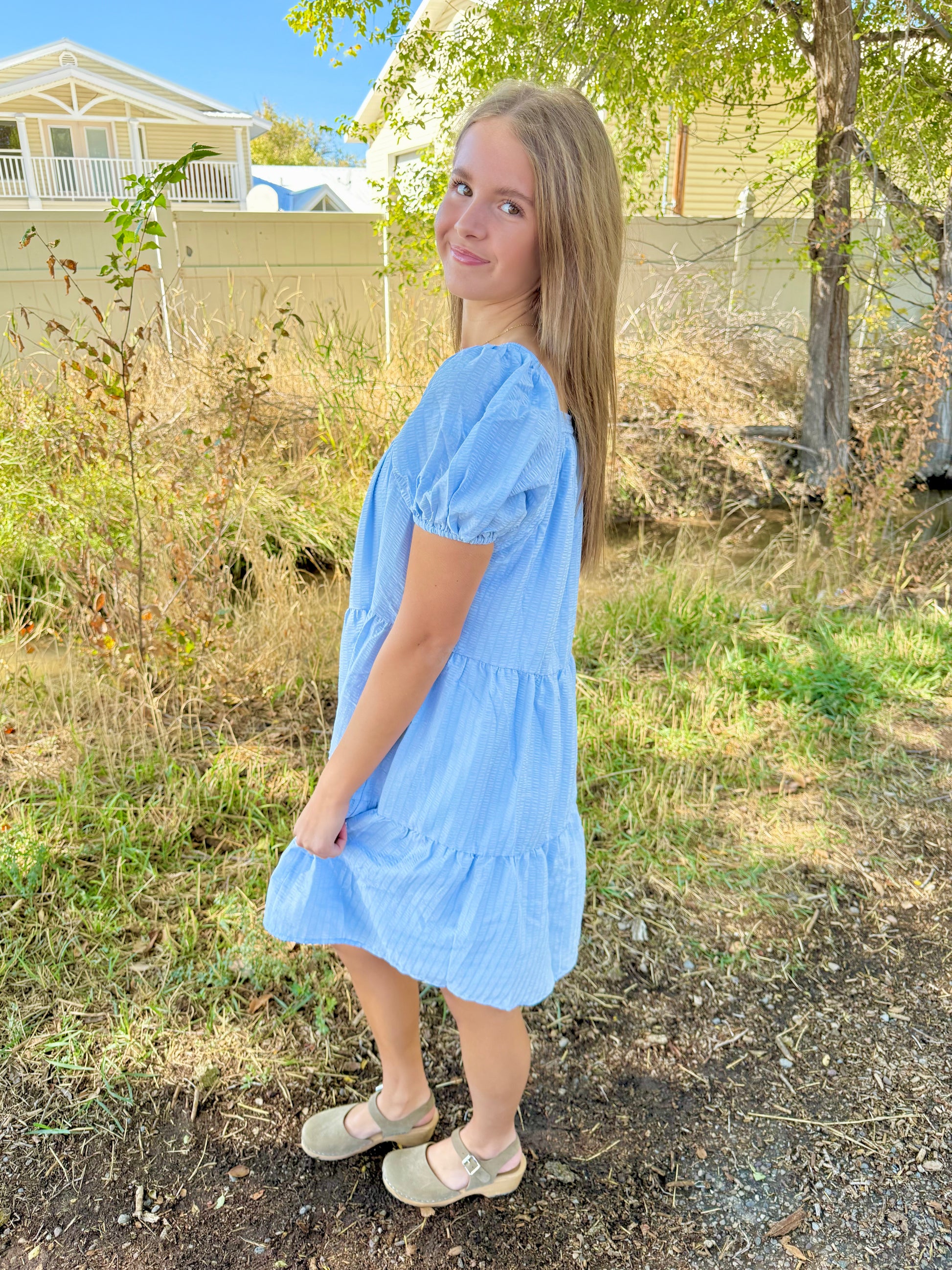 The Claudia Baby Blue Dress features a charming baby blue hue with a flowy, tiered design that flatters every figure. Its square neckline on both front and back adds a modern touch, while elastic sleeves ensure a comfortable fit. Practical side pockets blend seamlessly, making this knee-length dress both stylish and functional for any occasion.