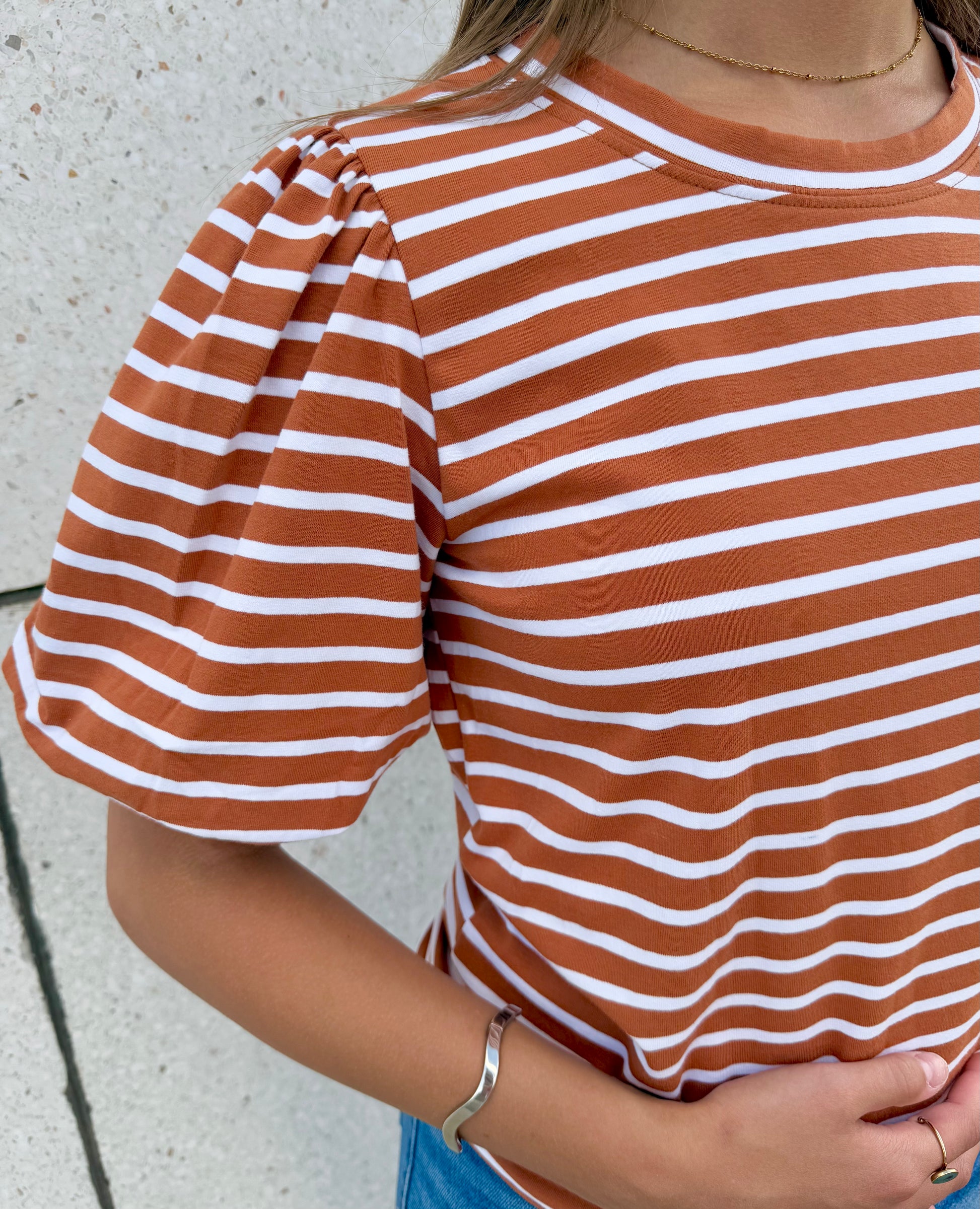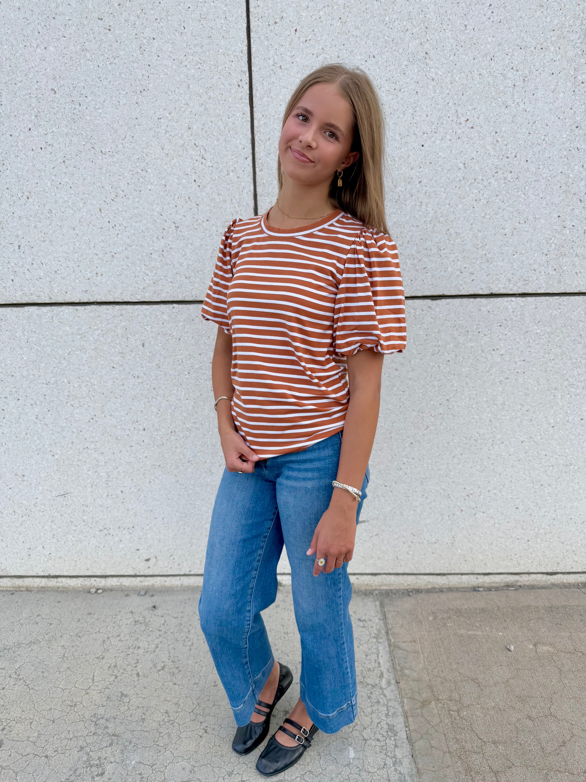 The Corrie Striped Top features elegant puff sleeves and flattering stripes that enhance your style effortlessly. Crafted from a soft, dreamy cotton blend, it offers cozy comfort perfect for the fall season. This versatile top is an optimistic addition to your wardrobe, ready to brighten up cooler days with ease.
