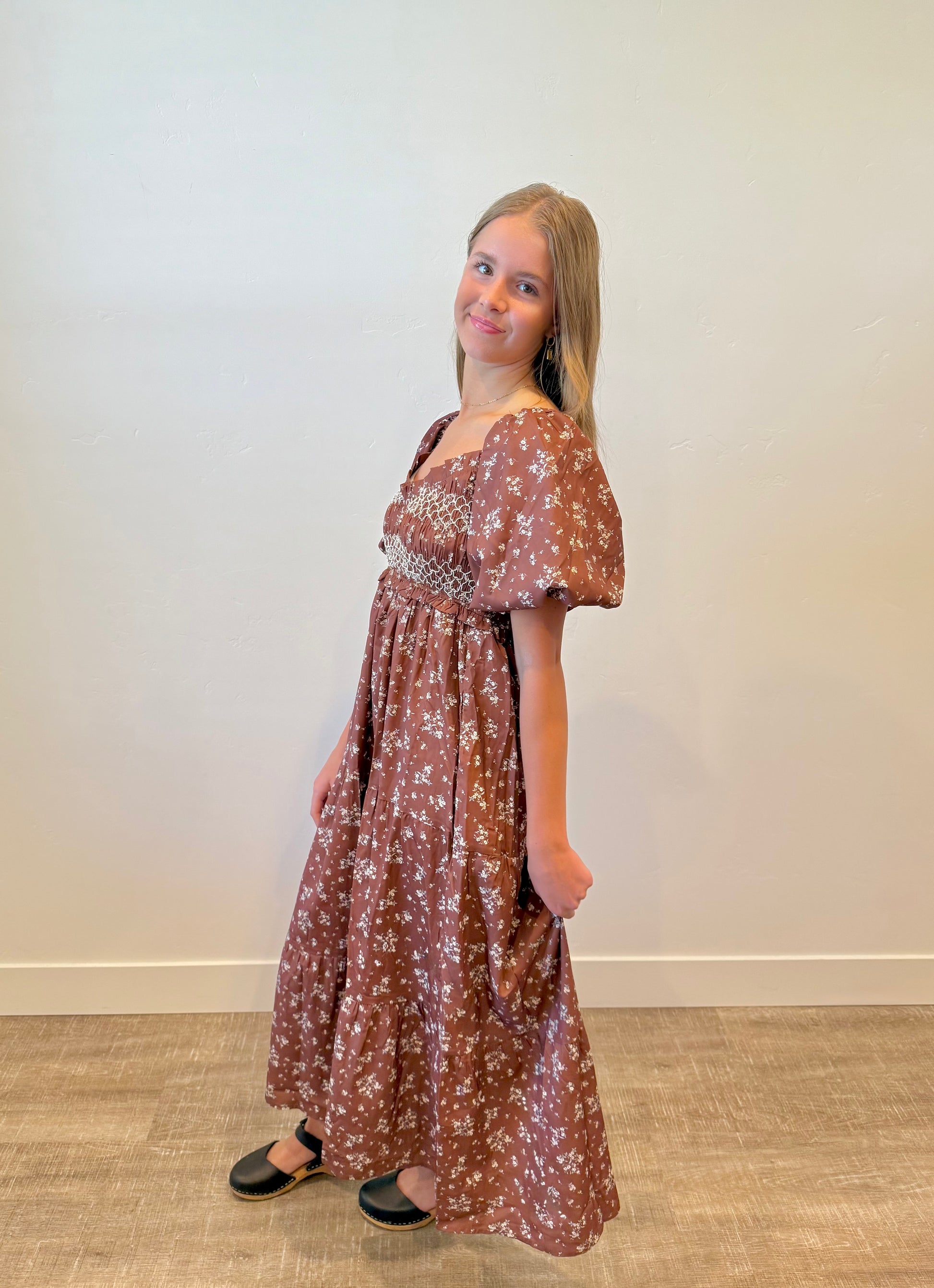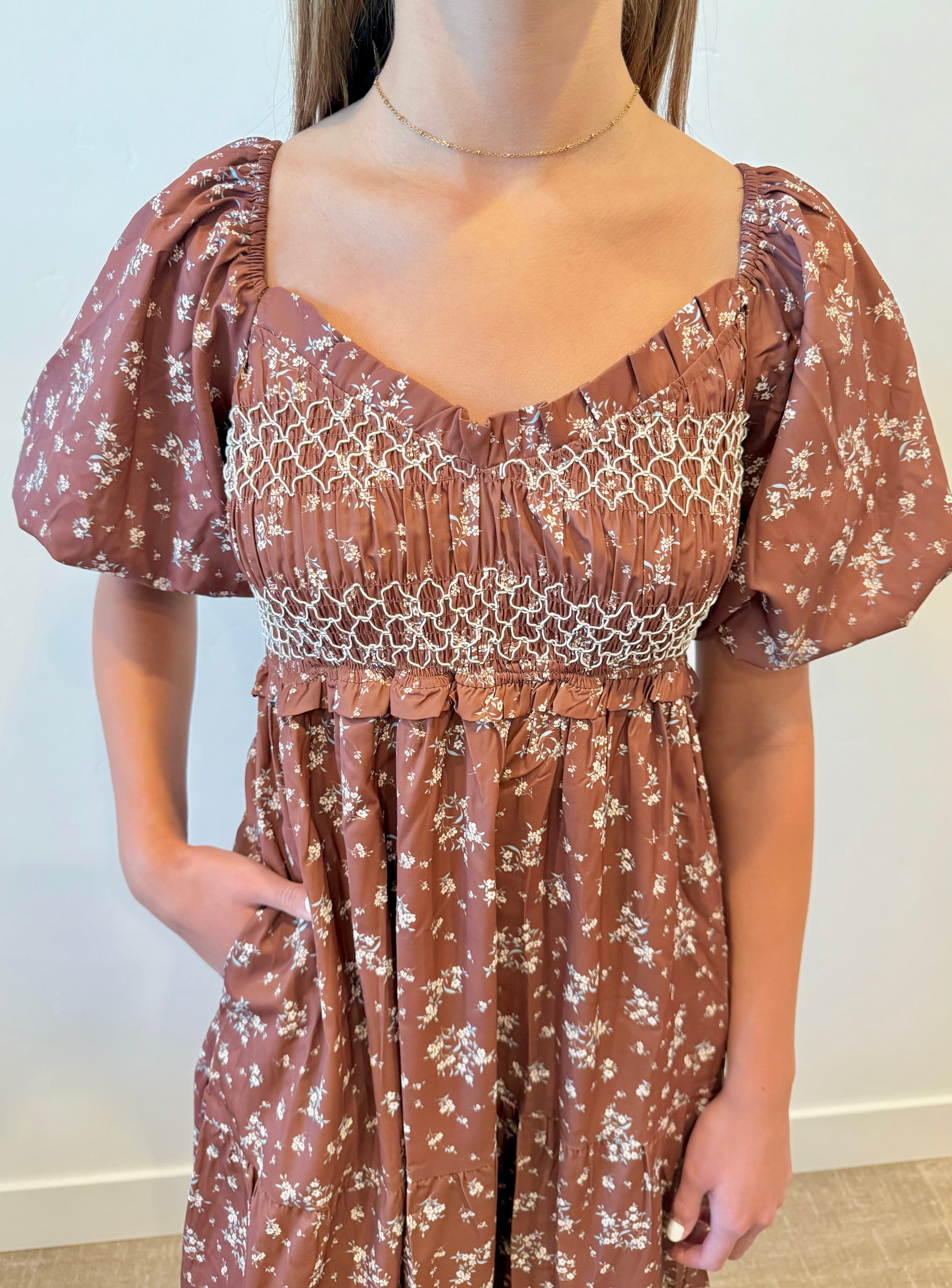 The Darcy Floral Dress features a warm brown base adorned with delicate white and light blue floral patterns. Smocking across the chest provides a comfortable, flattering fit, while a charming ruffle trims the waistband for added style. Slight puff sleeves with elastic bands ensure ease of movement and a perfect fit. Designed with practicality in mind, this maxi dress includes convenient side pockets, a tasteful V-neck front, and a square neckline at the back. Fully lined for comfort, the Darcy dress combines elegance and function for any occasion.