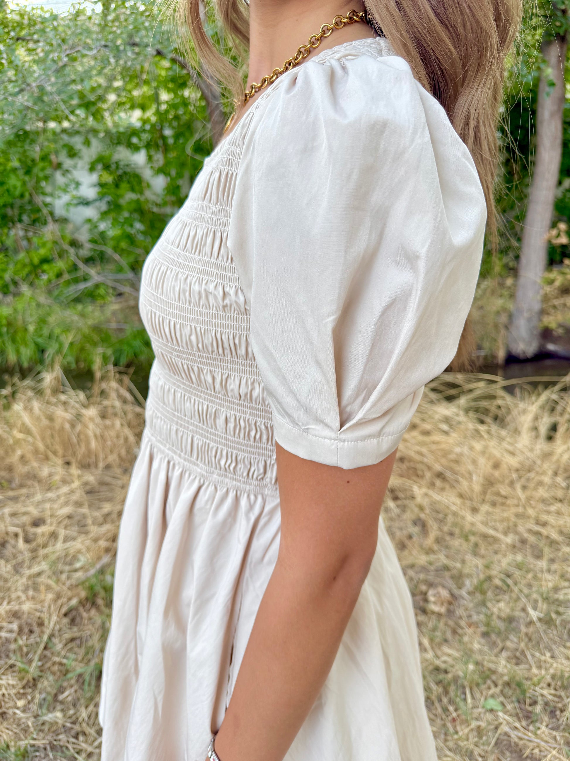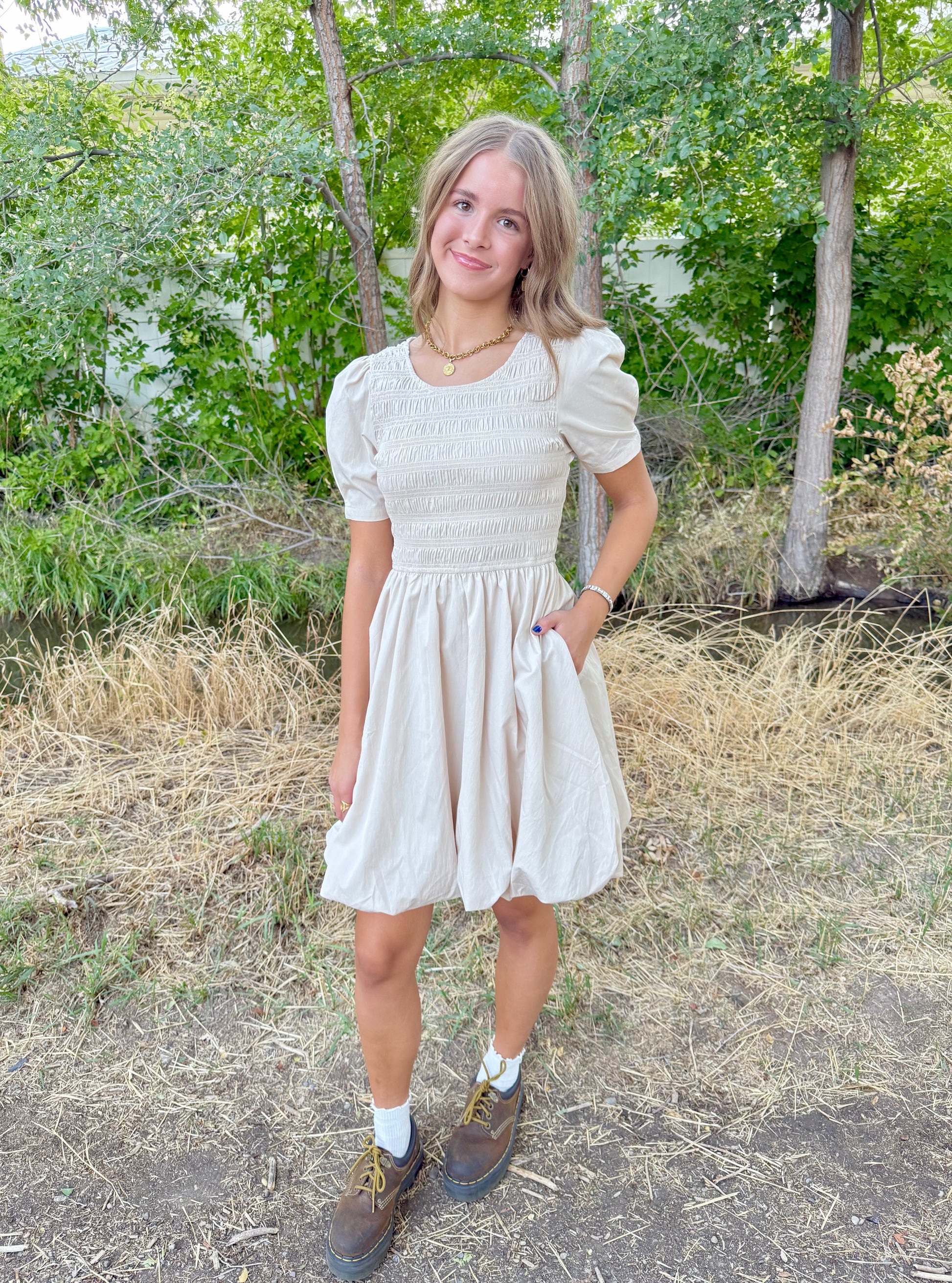 The Delilah Beige Dress features a charming bubble skirt and a smocked bodice for a comfortable, flattering fit. Its beautiful beige color complements the cute sleeve details, while convenient side pockets add a practical touch. Perfect for any occasion, this dress blends style with ease effortlessly.