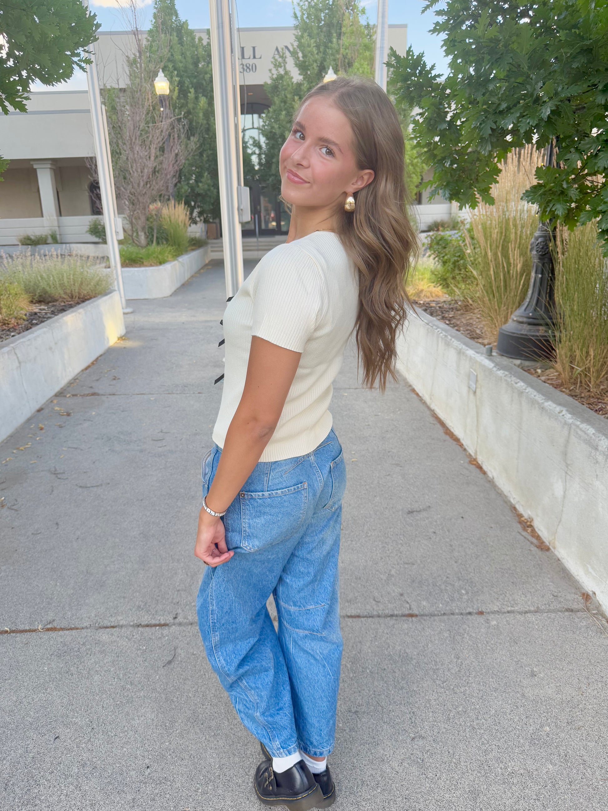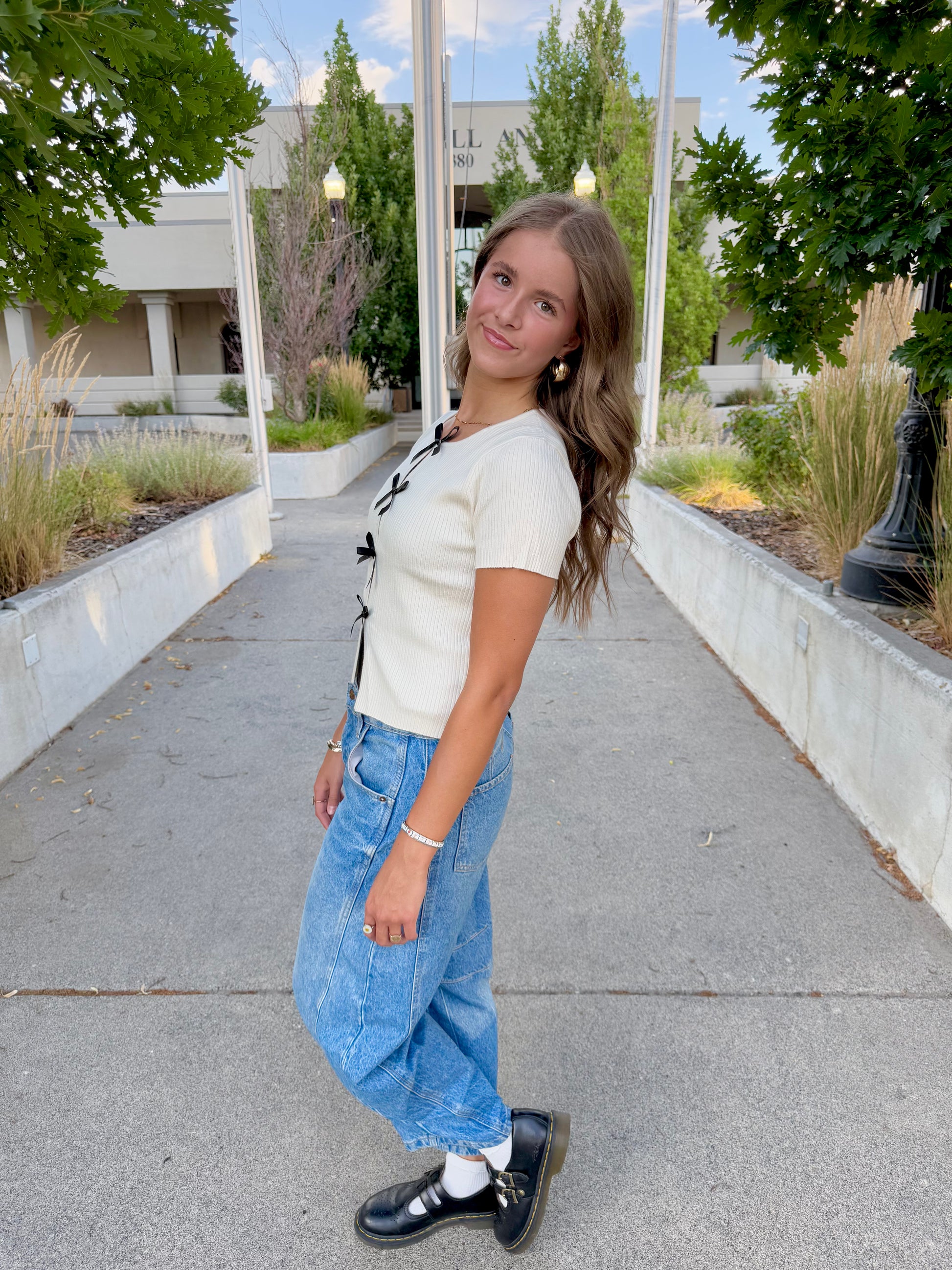 The Hollis Bow Sweater Top combines a charming black bow front detail with a soft cream ribbed fabric for a stylish yet comfortable fit. Made from flexible material, this top moves with you, making it perfect for everyday wear. Its playful design adds a fun touch to your wardrobe without compromising on comfort or versatility.