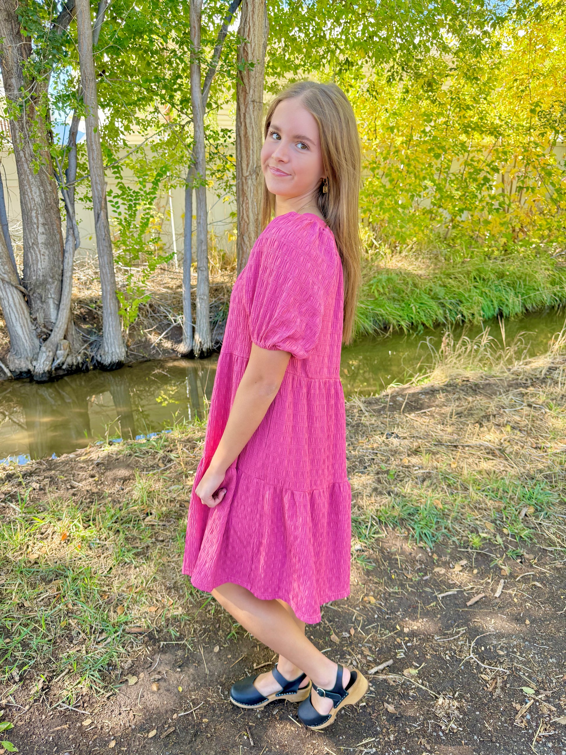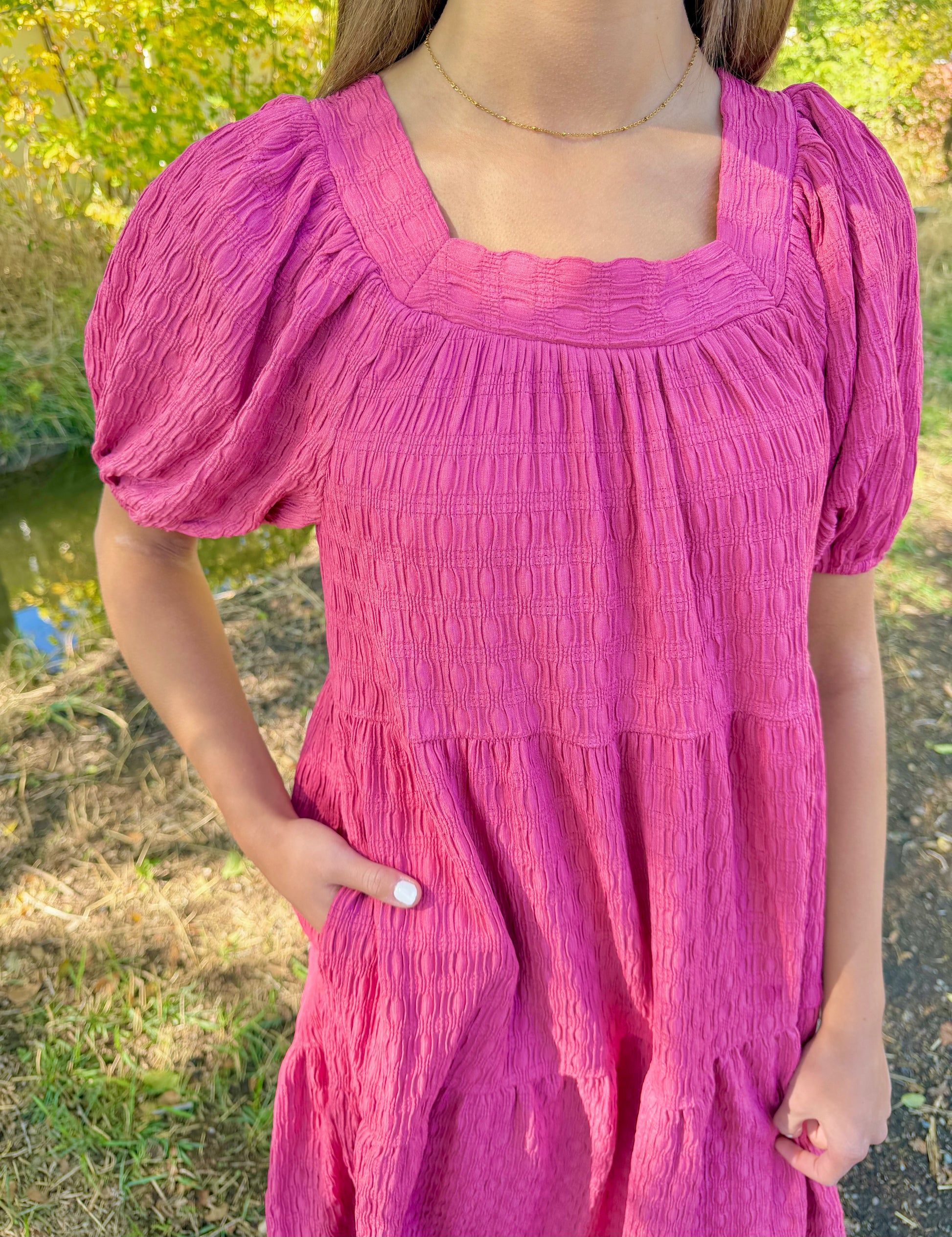The Luna Dress features a striking dark pink color with a stylish square neckline at both front and back. Its tiered design pairs perfectly with comfortable textured fabric and loose sleeves, finished with elastic cuffs for a flattering fit. Practical side pockets add convenience while maintaining its easy-going, flattering silhouette, making it an ideal choice for effortless comfort and style.