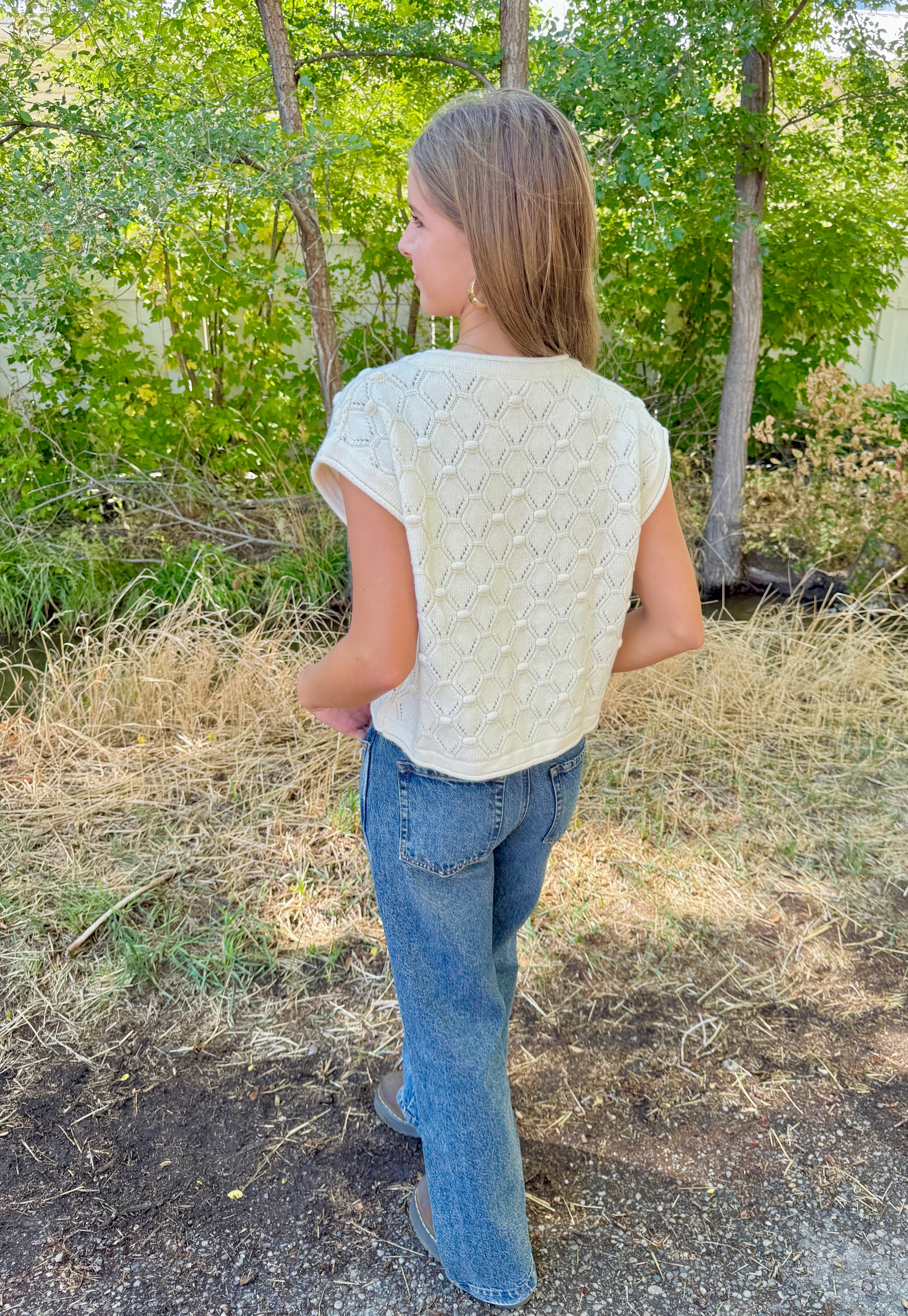 The Zaydee Sweater Top features a beautiful cream color and a flattering fit with cap sleeve fit that elegantly drape over the shoulders. Made from cozy sweater knit material, it offers comfort with a stylish crew neck neckline. This must-have top stands out with charming detailing, adding a subtle touch of uniqueness to your everyday wardrobe.