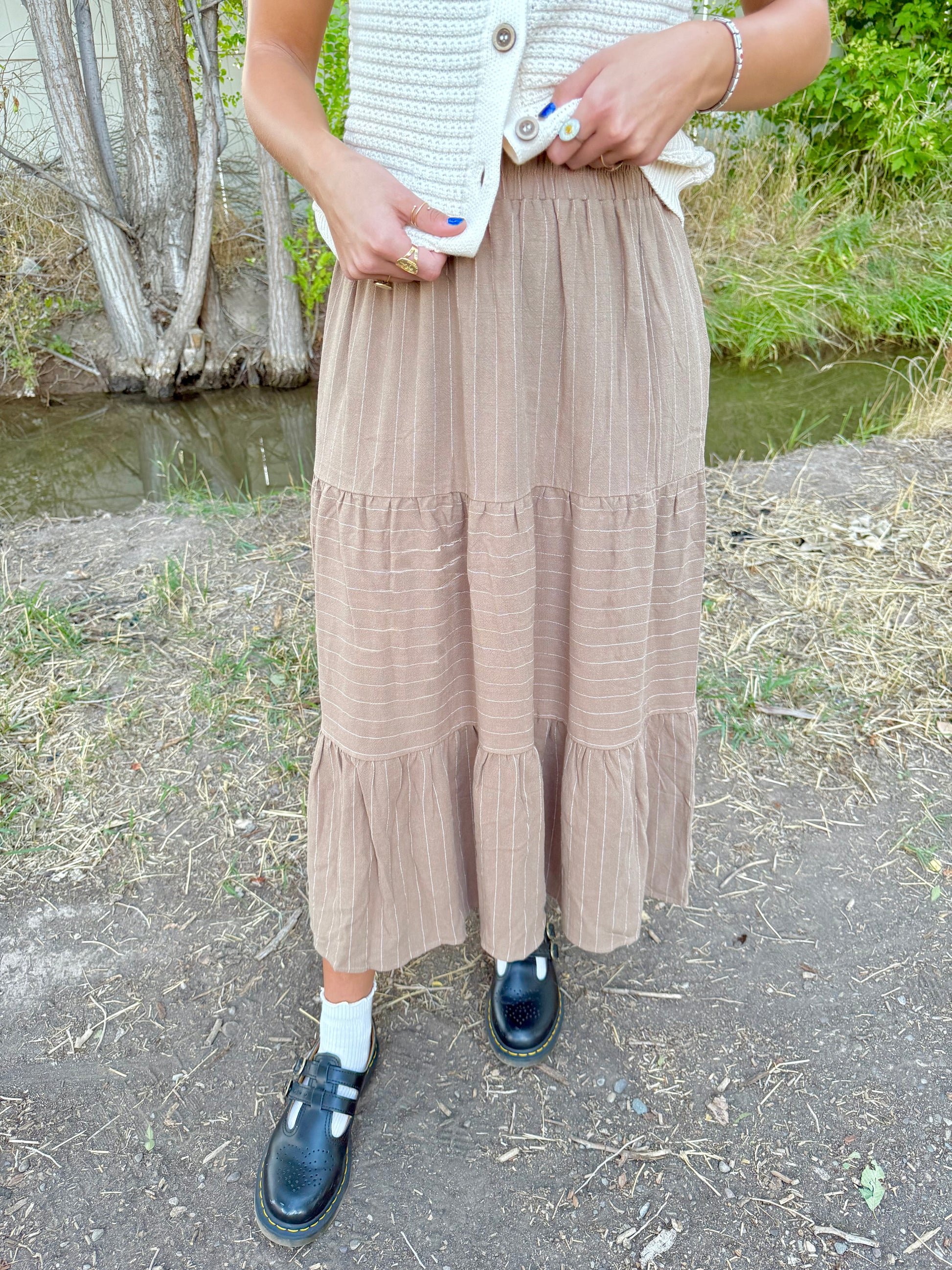The Oaklyn Striped Skirt offers effortless comfort with its flowy, maxi-length design in a warm brown shade accented by subtle white stripes. Featuring a flexible waistband and convenient side pockets, it moves with you for all-day ease. Its tiered silhouette adds a touch of playful elegance, making it perfect for both relaxed days and stylish outings.