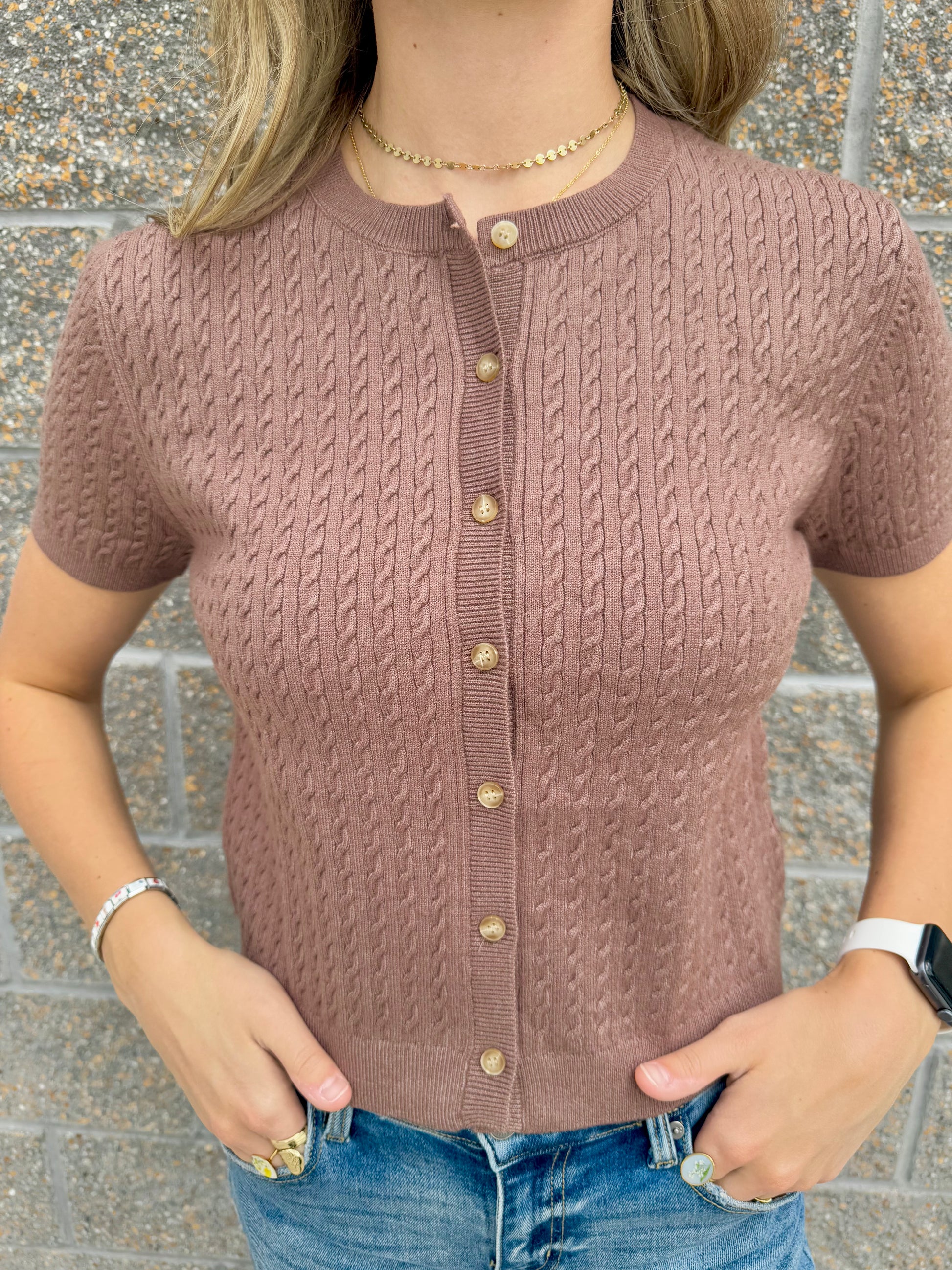 The Rowan Cable Cardigan is a versatile grab-and-go piece featuring a rich brown color and textured fabric that provides a comfortable, flattering fit. Its functional buttons add practicality, making it an ideal choice for everyday wear without compromising style or ease.