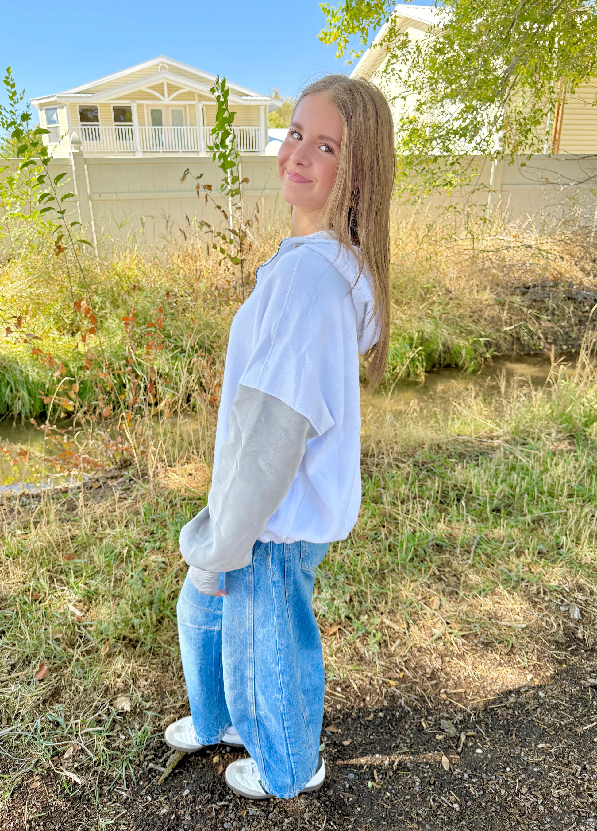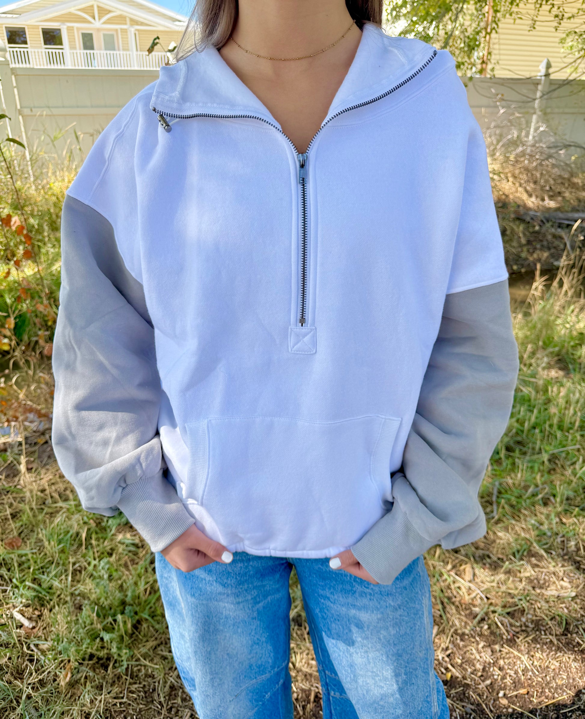 Stay cozy and stylish with the Starly Colorblock Hoodie. Featuring an oversized, relaxed fit and a half zip-up design, this hoodie offers long, comfortable sleeves and a front pocket for convenience. The crisp white bodice contrasts beautifully with soft gray sleeves, while elastic bands on the hemline and hood provide a customizable fit. Perfect for keeping warm, this super comfy hoodie is your go-to for effortless comfort and laid-back charm.