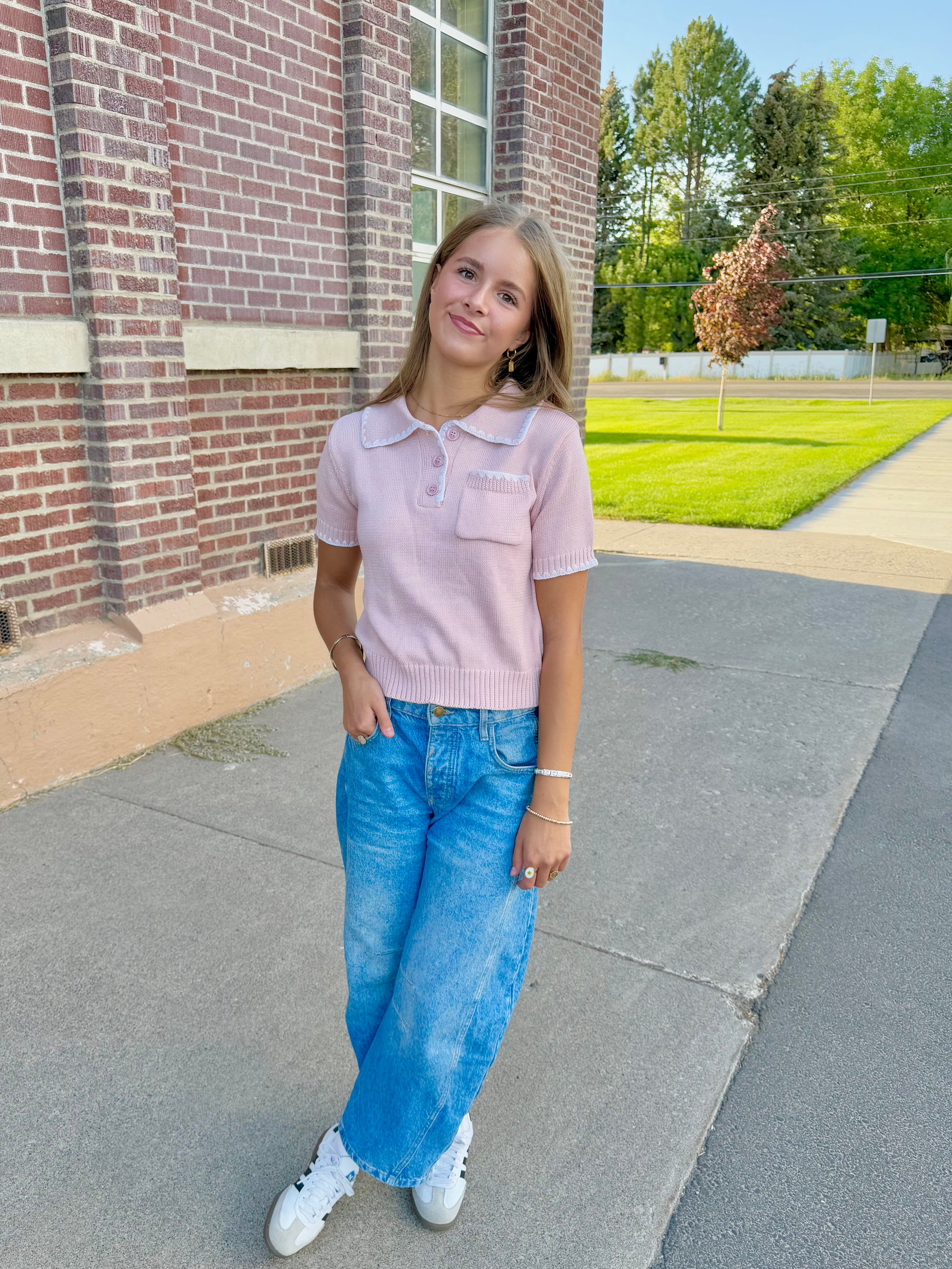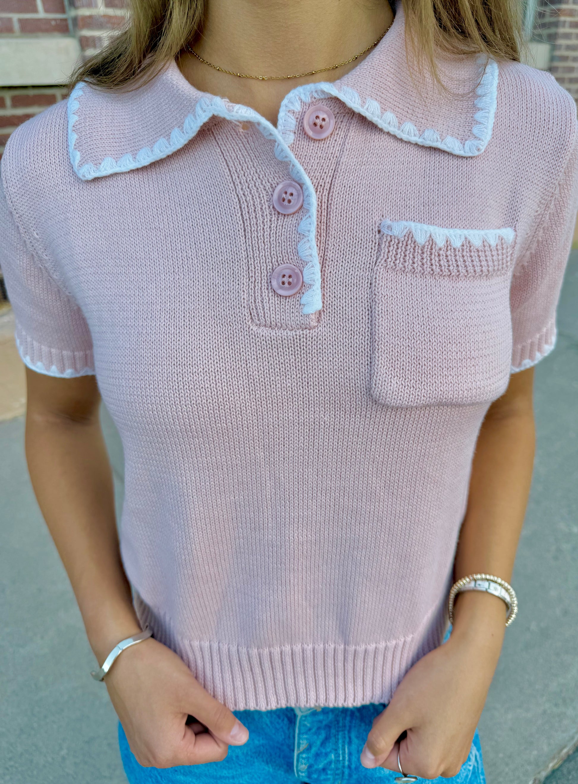 The Talk Pretty Sweater Top showcases a delightful peach pink shade paired with a flattering collar accented by white edge detailing. Made from quality fabric, this stylish and on-trend top combines comfort with a fresh, charming look perfect for any occasion.