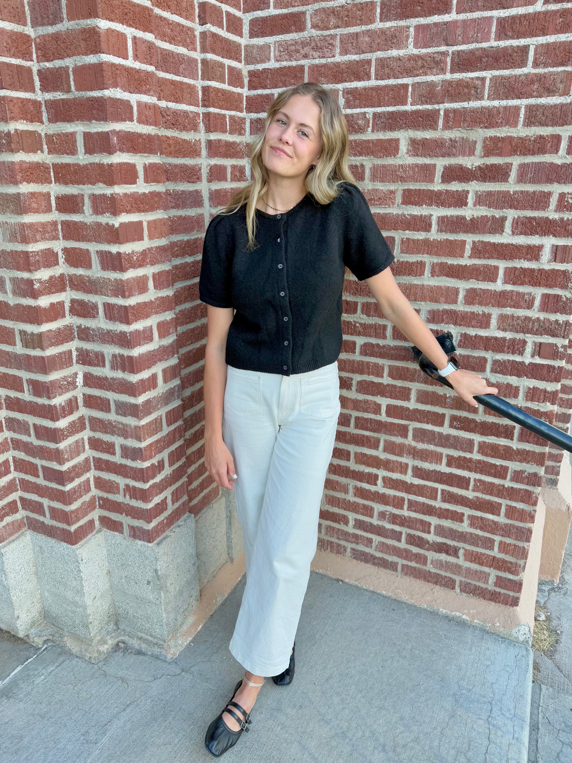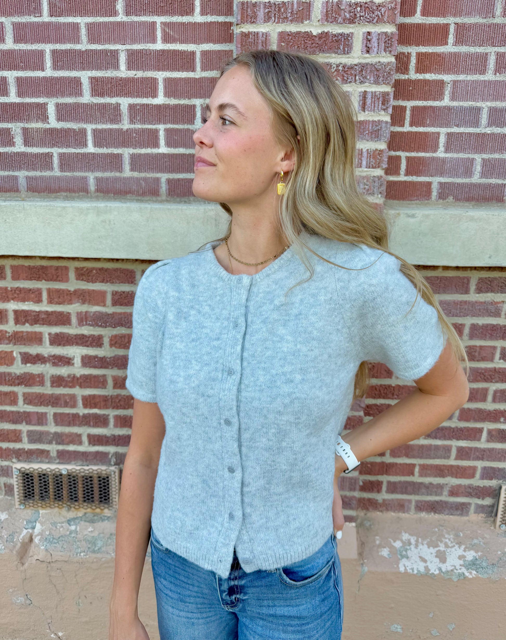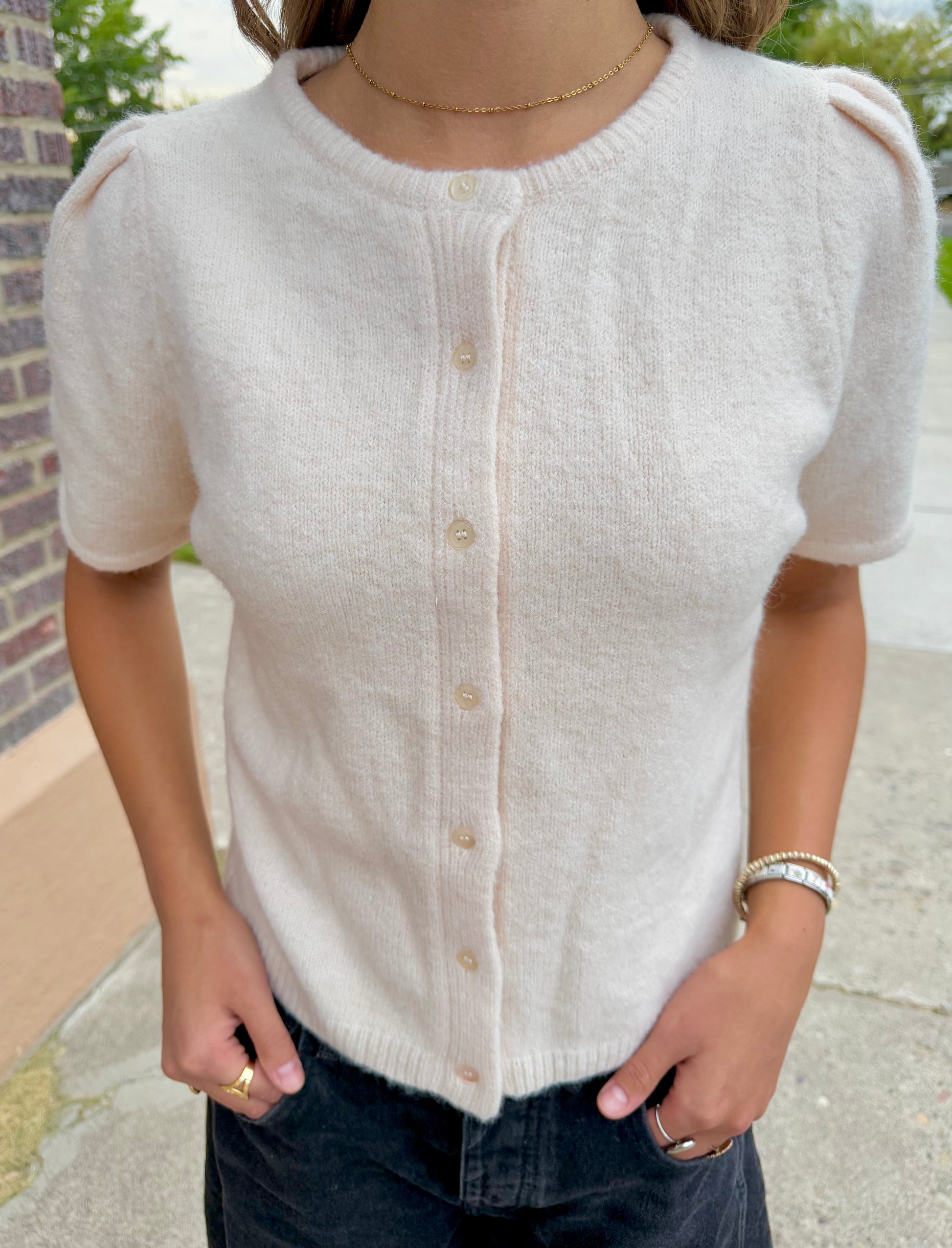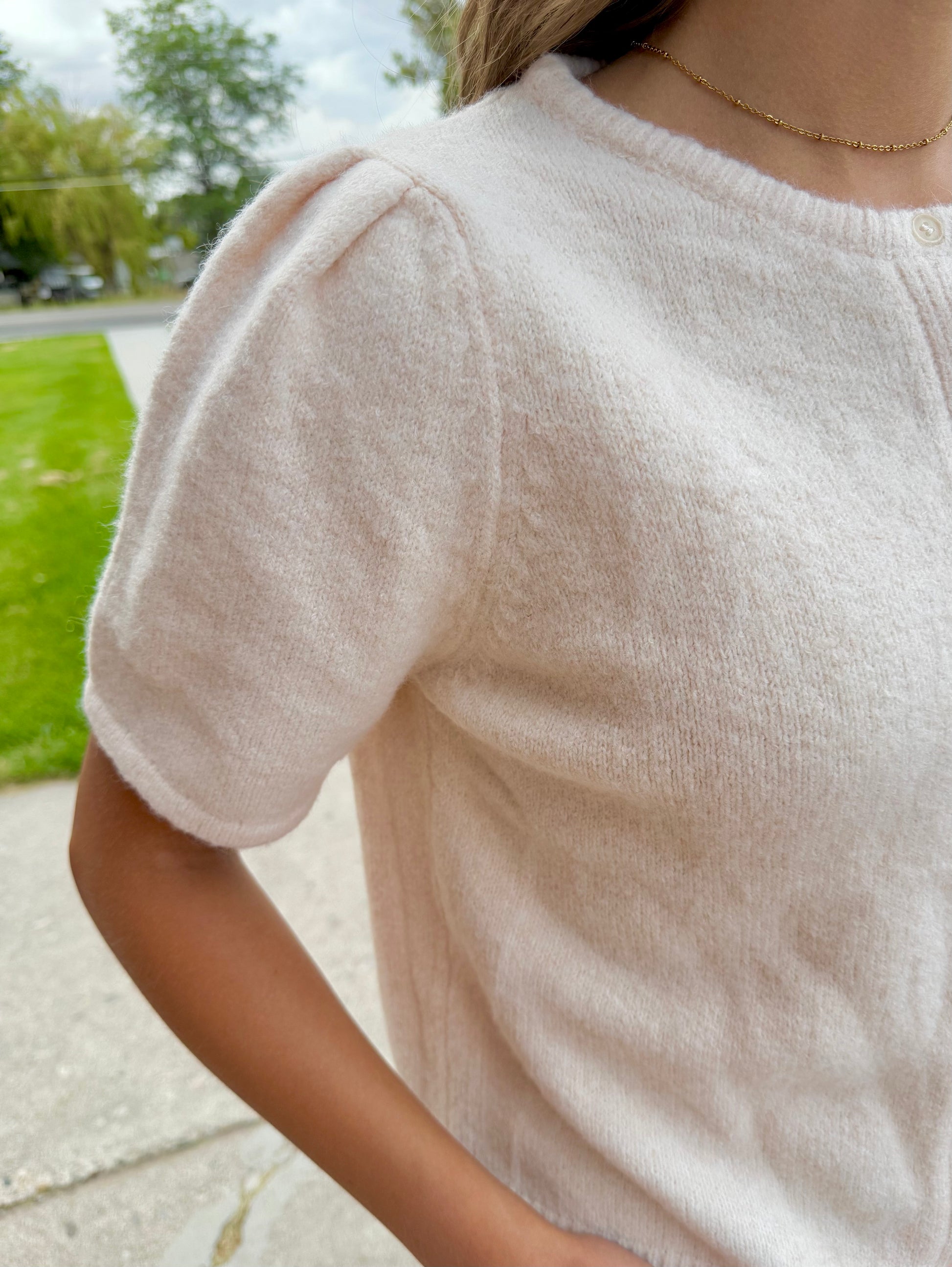 The Tess Sweater Top combines on-trend style with everyday comfort. Featuring a full working button-up front and cute short sleeves with a subtle puff, this soft, cozy top is a must-have addition to your wardrobe. Perfect for effortless layering or wearing on its own, it brings a fresh, optimistic vibe to any outfit.