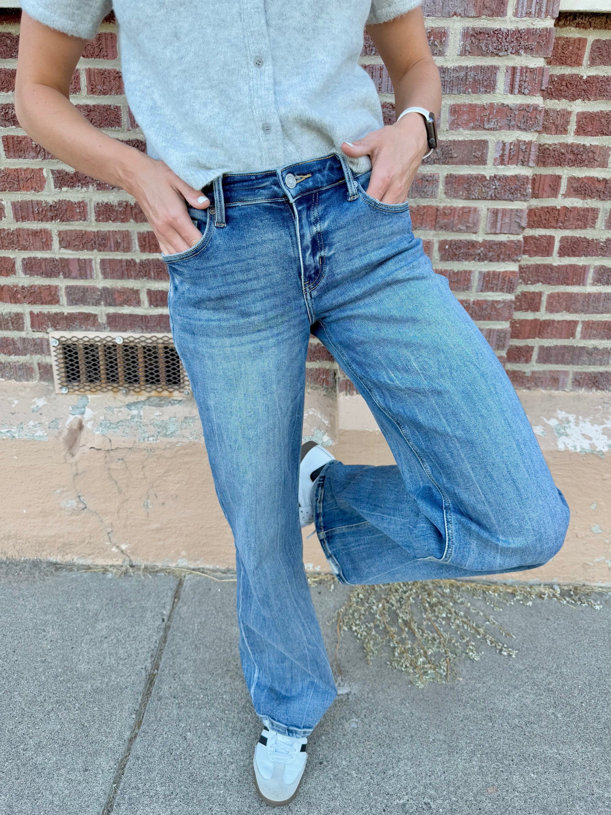 Micaela Denim offers a flattering mid-rise fit with a stylish wide leg silhouette. Crafted from medium wash denim blended with spandex, these jeans provide excellent stretch for all-day comfort. True to size, they effortlessly enhance any outfit with a modern, relaxed vibe.