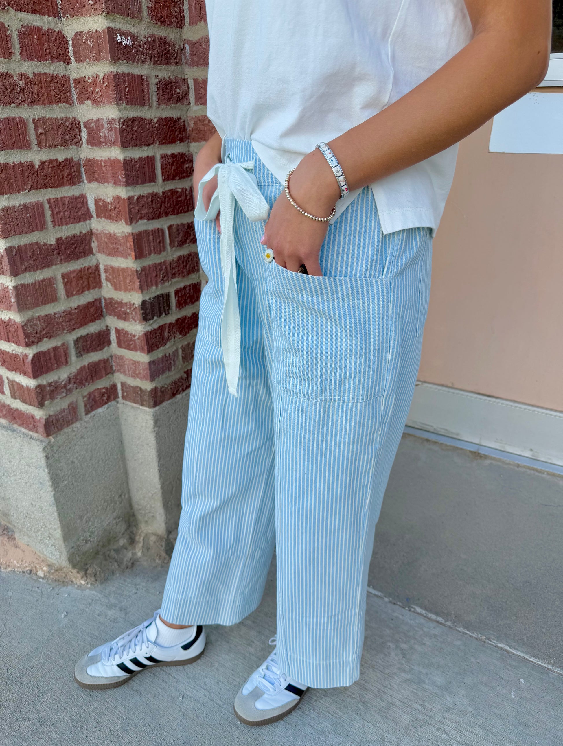 Experience comfort and style with the Willa Light Blue Striped Pants. Featuring a flexible elastic waistband and adjustable drawstring, these pants ensure a perfect fit every time. Functional front and back pockets add practicality, while the straight leg design offers a flattering, easy-to-wear silhouette. Ideal for everyday wear, these pants combine convenience and chic effortlessly.